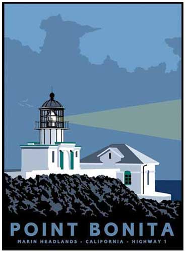 "I had been to plenty of lighthouses along the west coast growing up, but none of them got my imagination going like the Point Bonita Lighthouse. I first visited during a sixth grade field trip to San Francisco. I admit, I wasn't too excited to get off the bus to hike down a steep road in the cold to see another lighthouse- but everything changed immediately after walking through the tunnel that leads to it. We were surrounded by fog out on those cold rocks, just above heavy, thunderous surf, and had to cross two at a time the (seemingly) flimsy wooden bridge that seemed to take you to the very end of the earth. It was absolutely thrilling. In an instant, I understood why lighthouses were so important and have been fascinating ever since. 'Point Bonita' is a 9 color print and required over 2,200 hand-pulled color impressions to complete." ~Jake |