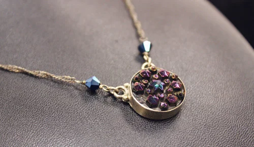Addition collections to be displayed veer from the classic black and silver victorian button pieces. Nouveau's additional jewelry line is embellished with vintage glass. The brightly colorful and sparkly items glisten from all angles while her vintage button collection is more subtle.